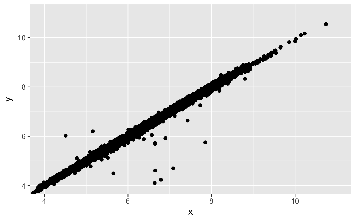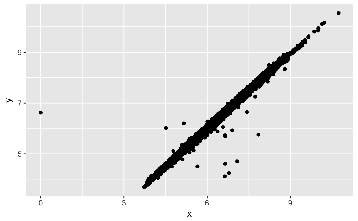 xandyvalues, which makes the points outliers even though theirxandyvalues appear normal when examined separately.ggplot(data = diamonds) + geom_point(mapping = aes(x = x, y = y)) + coord_cartesian(xlim = c(4, 11), ylim = c(4, 11))