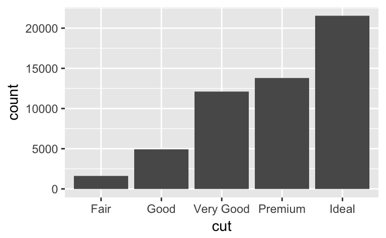 How you visualise the distribution of a variable will depend on whether the variable is categorical or continuous. A variable is categorical if it can only take one of a small set of values. In R, categorical variables are usually saved as factors or character vectors. To examine the distribution of a categorical variable, use a bar chart: