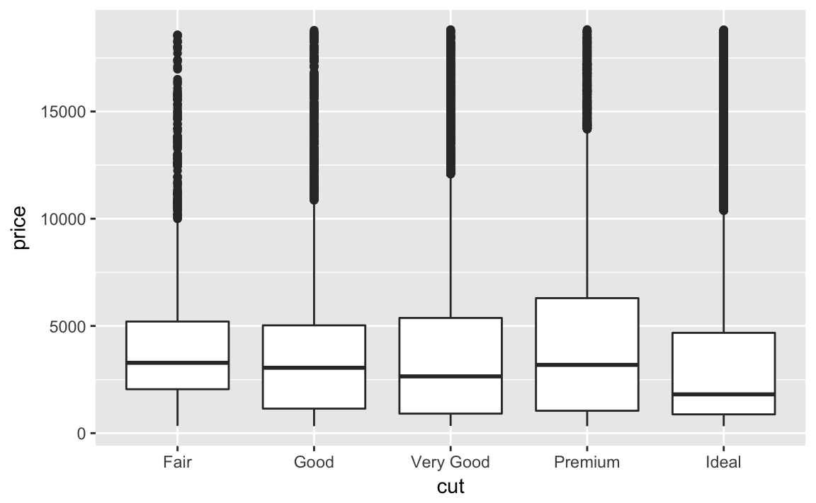 cut_width(x, width), as used above, divides x into bins of width width. By default, boxplots look roughly the same (apart from number of outliers) regardless of how many observations there are, so it’s difficult to tell that each boxplot summarises a different number of points. One way to show that is to make the width of the boxplot proportional to the number of points with varwidth = TRUE.