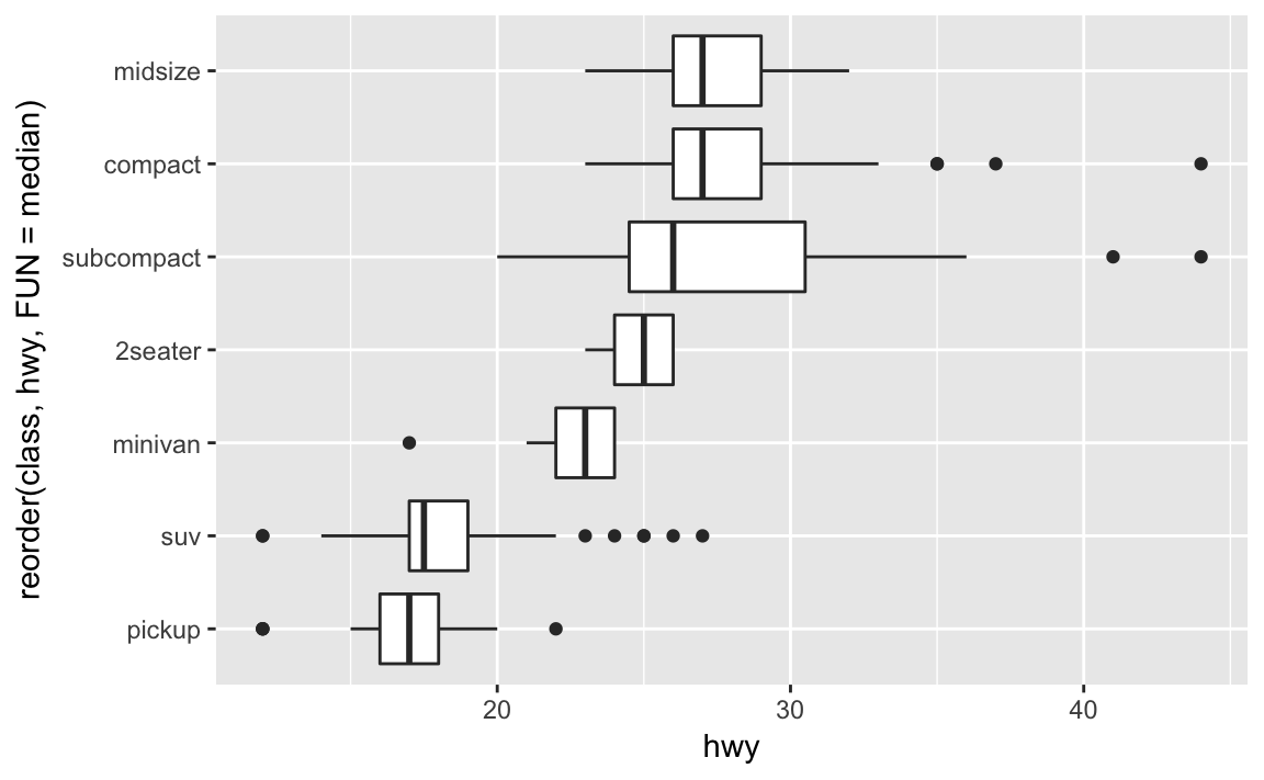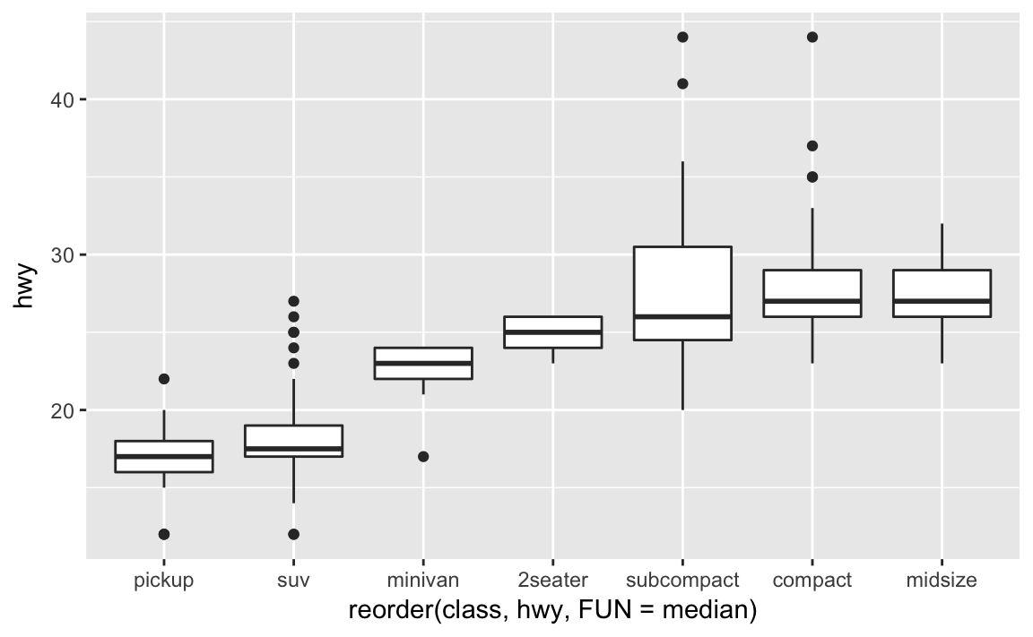 geom_boxplot(mapping = aes(x = reorder(class, hwy, FUN = median), y = hwy)) +