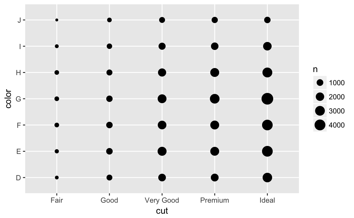 The size of each circle in the plot displays how many observations occurred at each combination of values. Covariation will appear as a strong correlation between specific x values and specific y values.