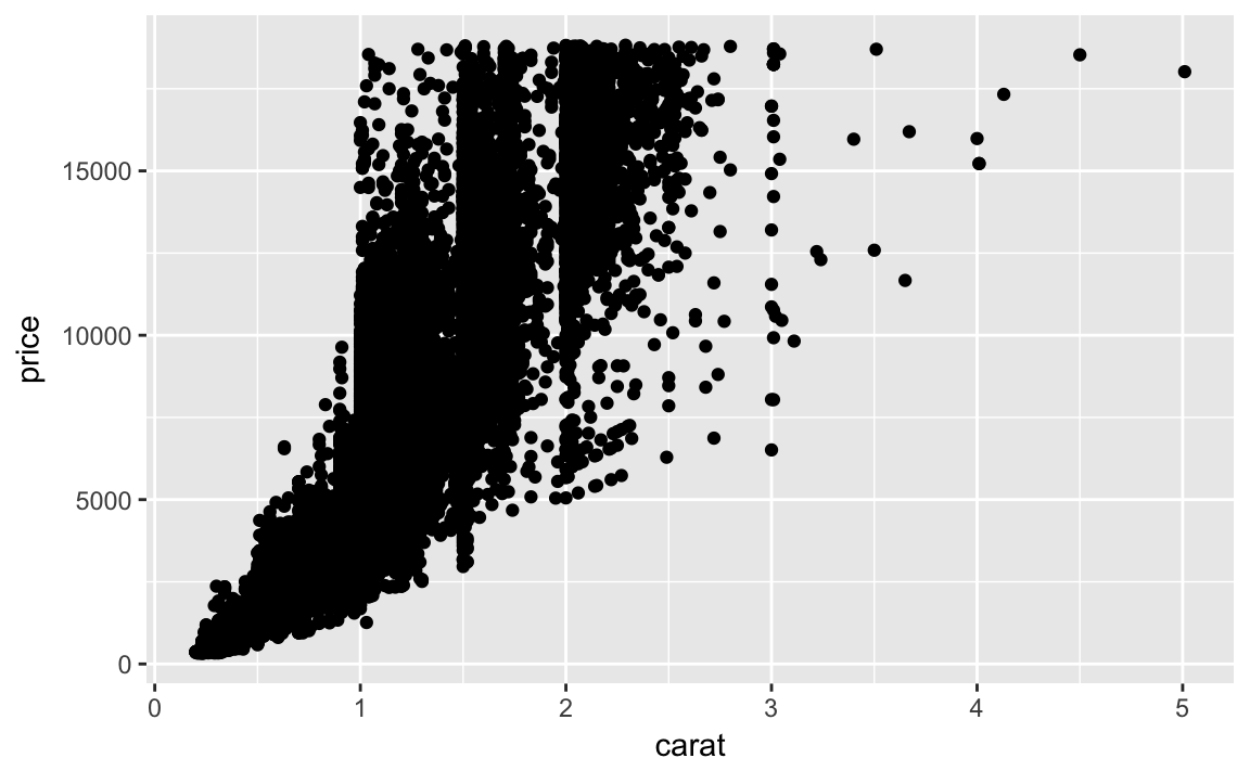 You’ve already seen one great way to visualise the covariation between two continuous variables: draw a scatterplot with geom_point(). You can see covariation as a pattern in the points. For example, you can see an exponential relationship between the carat size and price of a diamond.
