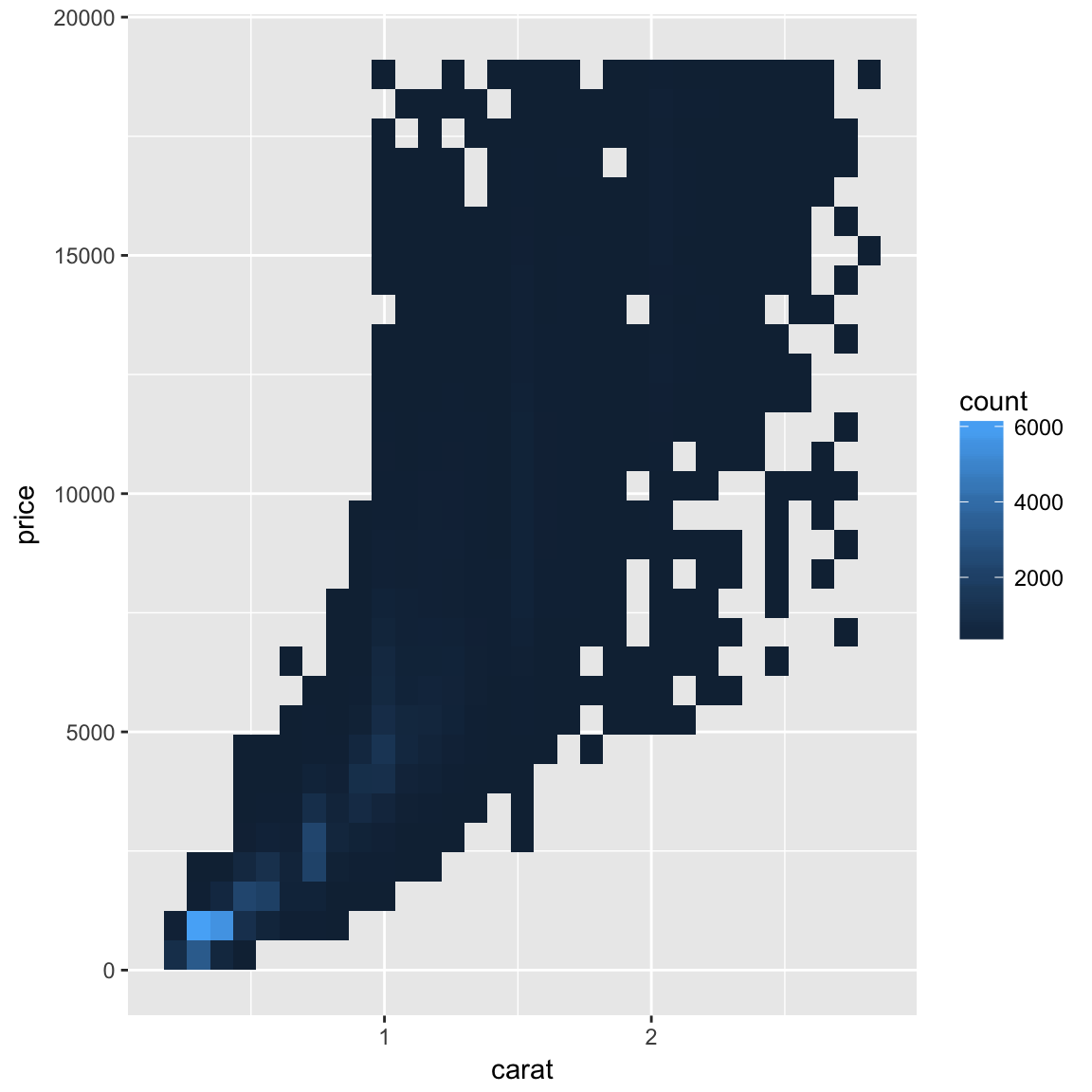 geom_bin2d() and geom_hex() divide the coordinate plane into 2d bins and then use a fill color to display how many points fall into each bin. geom_bin2d() creates rectangular bins. geom_hex() creates hexagonal bins. You will need to install the hexbin package to use geom_hex().