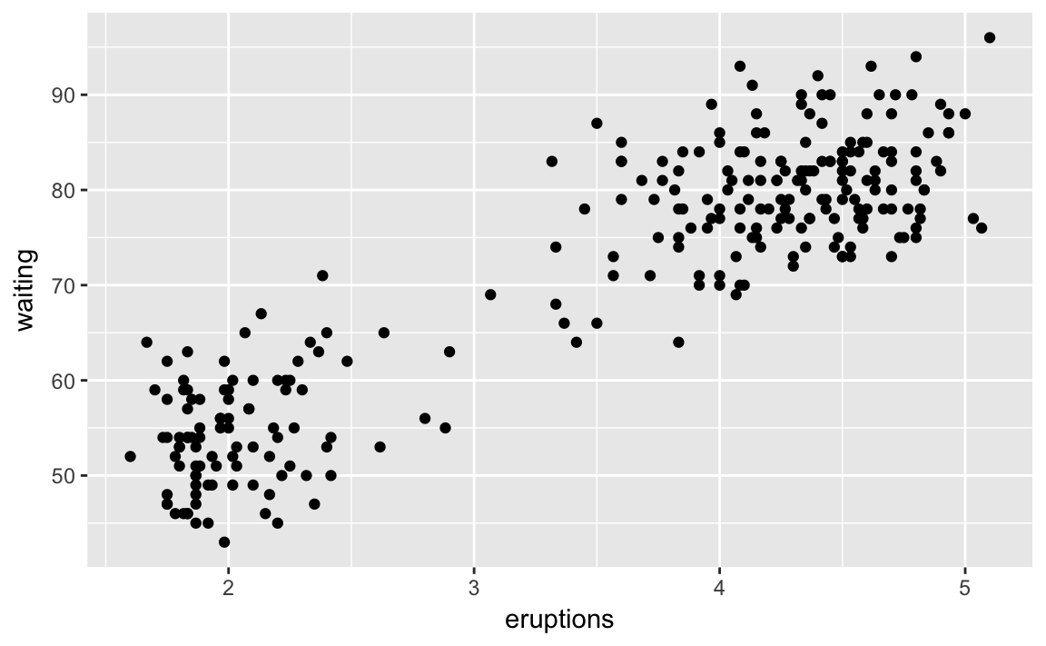 A scatterplot of Old Faithful eruption lengths versus the wait time between eruptions shows a pattern: longer wait times are associated with longer eruptions. The scatterplot also displays the two clusters that we noticed above.