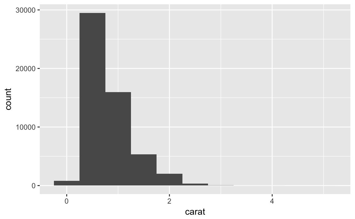 #> # ... with 5 more rowsA histogram divides the x-axis into equally spaced bins and then uses the height of a bar to display the number of observations that fall in each bin. In the graph above, the tallest bar shows that almost 30,000 observations have a carat value between 0.25 and 0.75, which are the left and right edges of the bar.