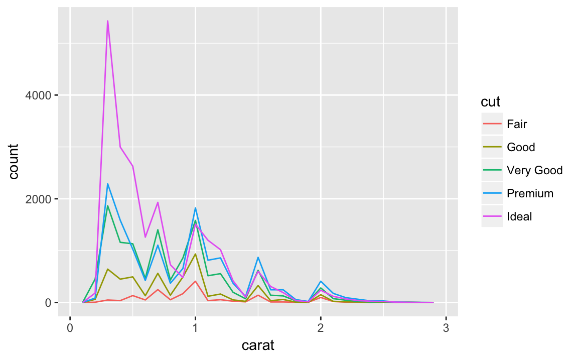 ggplot(data = smaller, mapping = aes(x = carat, colour = cut)) +