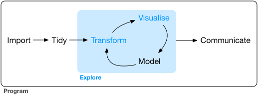 Finally, in exploratory data analysis, you’ll combine visualisation and transformation with your curiosity and scepticism to ask and answer interesting questions about data.