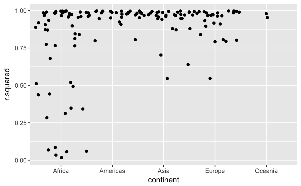 #> # ... with 136 more rows(I’m cheating a little by grouping on both continent and country. Given country, continent is fixed, so this doesn’t add any more groups, but it’s an easy way to carry an extra variable along for the ride.)