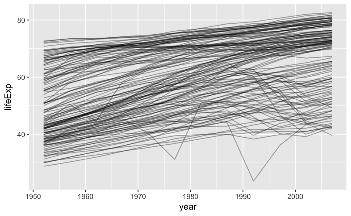 This is a small dataset: it only has ~1,700 observations and 3 variables. But it’s still hard to see what’s going on! Overall, it looks like life expectancy has been steadily improving. However, if you look closely, you might notice some countries that don’t follow this pattern. How can we make those countries easier to see?