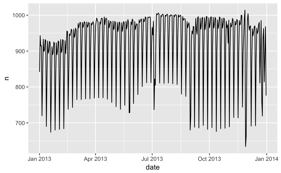 Let’s work through a similar process for a dataset that seems even simpler at first glance: the number of flights that leave NYC per day. This is a really small dataset — only 365 rows and 2 columns — and we’re not going to end up with a fully realised model, but as you’ll see, the steps along the way will help us better understand the data. Let’s get started by counting the number of flights per day and visualising it with ggplot2.
