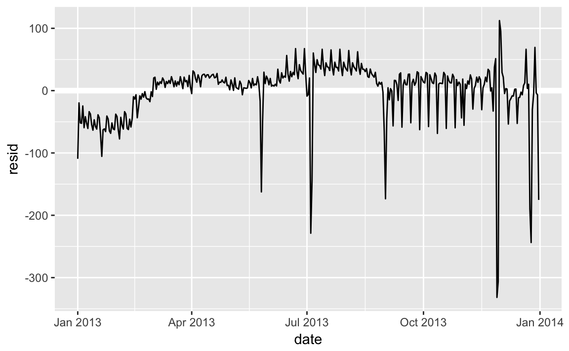 Our model is finding the mean effect, but we have a lot of big outliers, so mean tends to be far away from the typical value. We can alleviate this problem by using a model that is robust to the effect of outliers: MASS::rlm(). This greatly reduces the impact of the outliers on our estimates, and gives a model that does a good job of removing the day of week pattern: