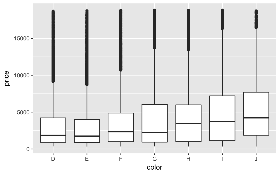 ggplot(diamonds, aes(color, price)) + geom_boxplot()
