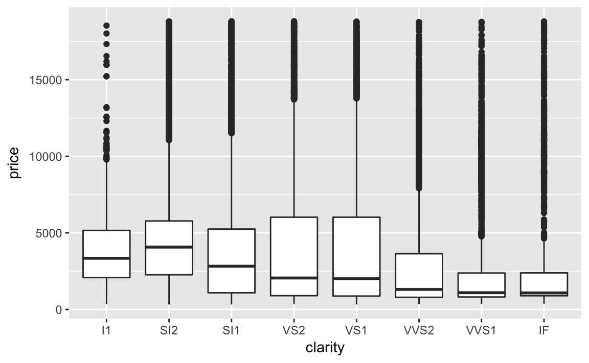 ggplot(diamonds, aes(clarity, price)) + geom_boxplot()