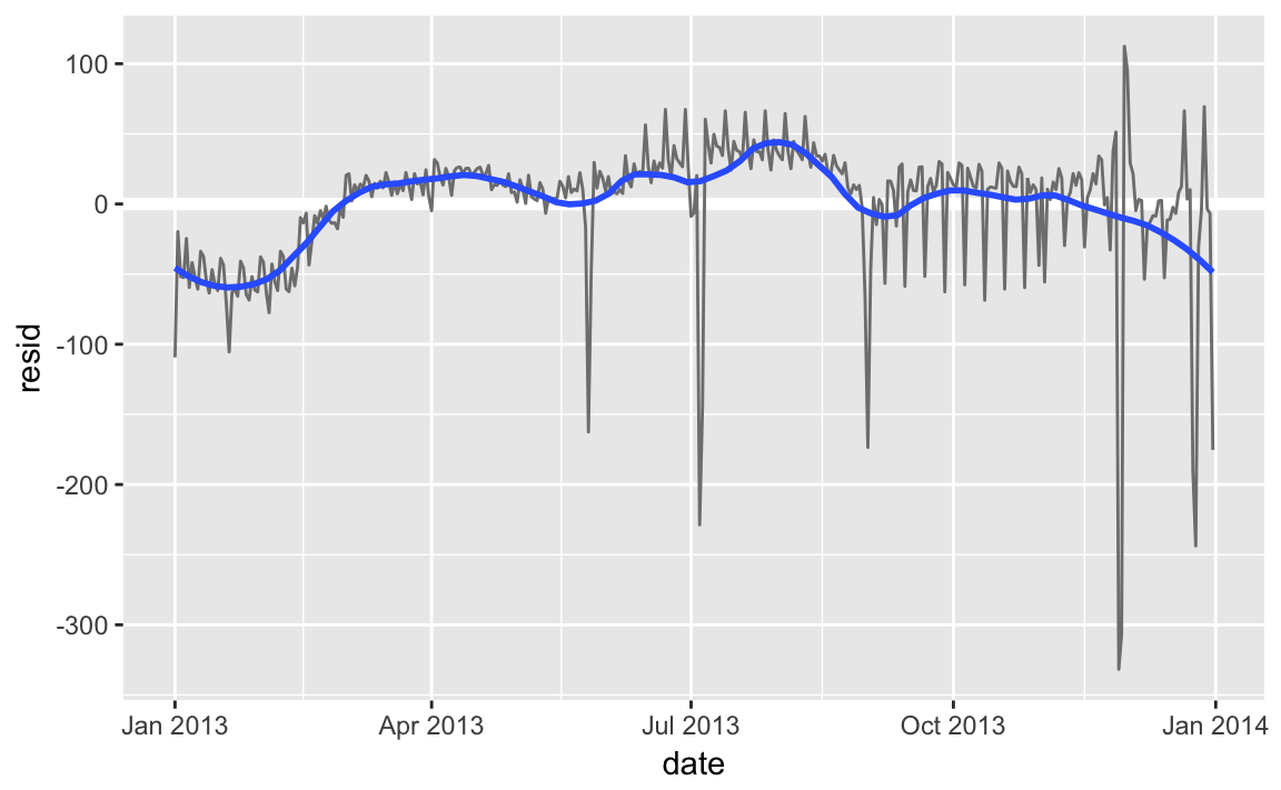 3. There seems to be some smoother long term trend over the course of a year. We can highlight that trend with geom_smooth():