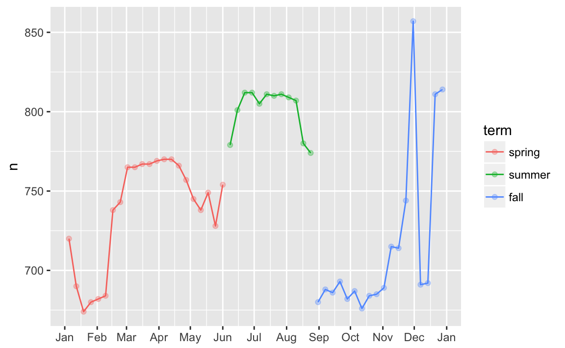 Lets create a “term” variable that roughly captures the three school terms, and check our work with a plot: