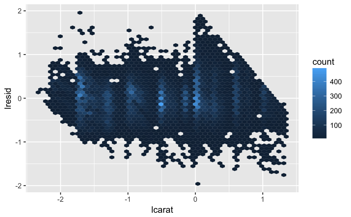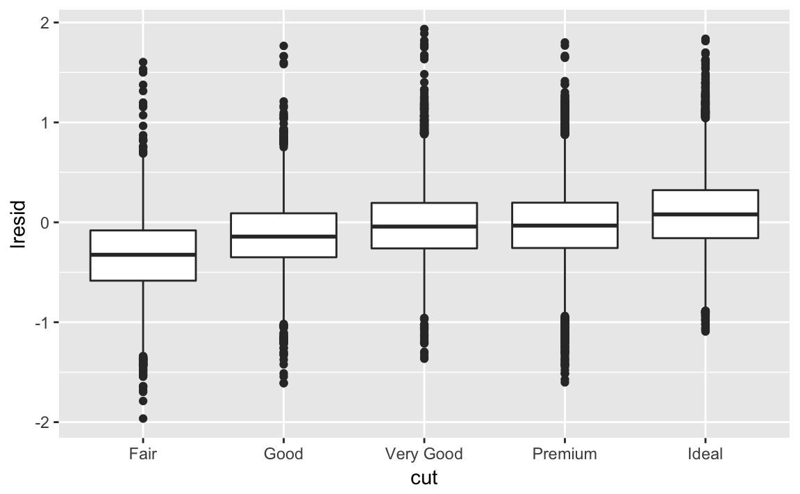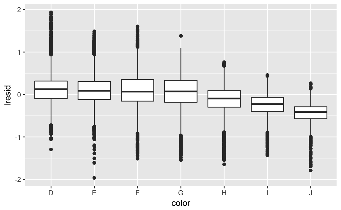 Now we see the relationship we expect: as the quality of the diamond increases, so to does it’s relative price. To interpret the y axis, we need to think about what the residuals are telling us, and what scale they are on. A residual of -1 indicates that lprice was 1 unit lower than a prediction based solely on its weight. \(2^{-1}\) is 1/2, points with a value of -1 are half the expected price, and residuals with value 1 are twice the predicted price.