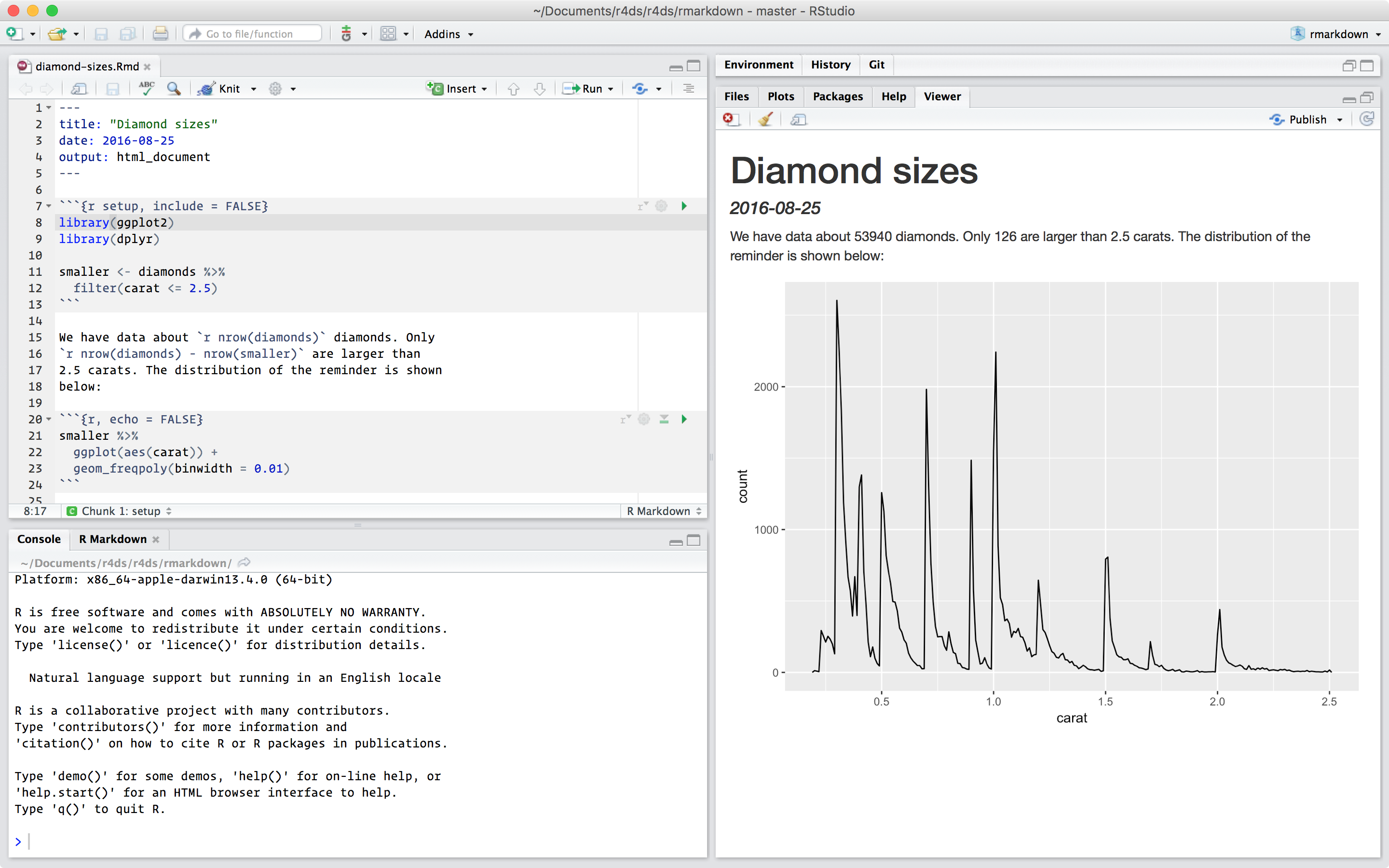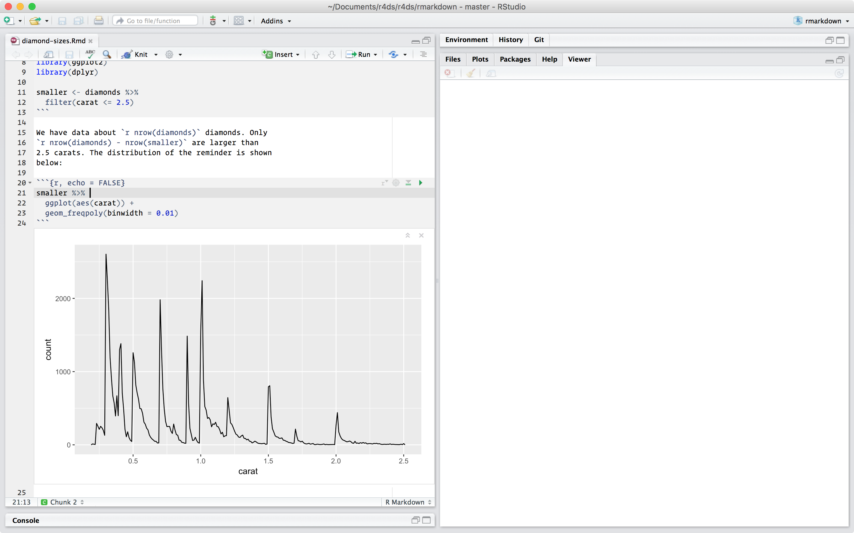 3. Copy and paste the contents of diamond-sizes.Rmd from https://github.com/hadley/r4ds/tree/master/rmarkdown in to a local R markdown document. Check that you can run it, then add text after the frequency polygon that describes its most striking features.
