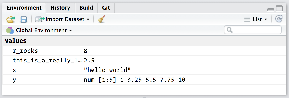 You will make lots of assignments and <- is a pain to type. Don’t be lazy and use =: it will work, but it will cause confusion later. Instead, use RStudio’s keyboard shortcut: Alt + - (the minus sign). Notice that RStudio automagically surrounds <- with spaces, which is a good code formatting practice. Code is miserable to read on a good day, so giveyoureyesabreak and use spaces.